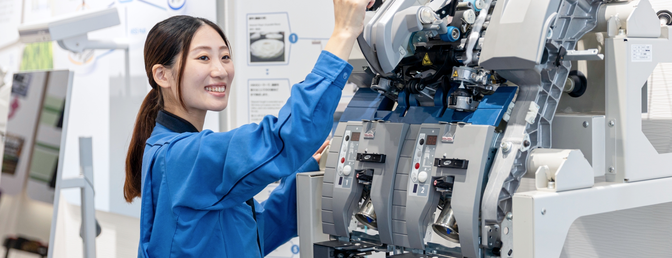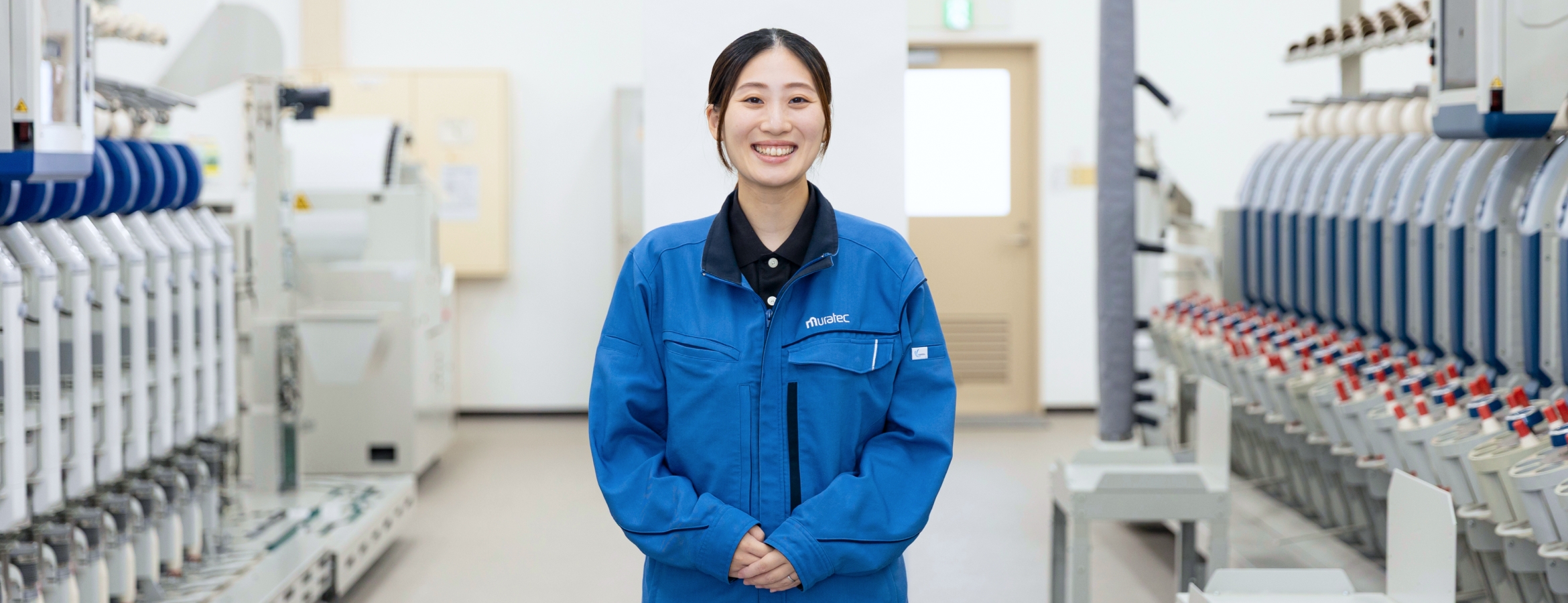 シームレスな連携。繊維機械事業部の制御開発チームで、機械の制御部分を担うプログラムを作成し、モーターを動かしたり、センサーから情報を取ったりという、いわば「機械の基盤」をつくる業務にあたっています。機械が正常に動作するには、メカ・電気・ソフトなど各要素の連携が欠かせません。最終的に1台の機械として滑らかに動くように、私も他のチームの人たちと連携しながら日々開発設計に取り組んでいます。他にも、クラウドに上げたデータを分析して機械の性能をよりよくする取り組みや、新規事業を提案する業務にも携わっています。