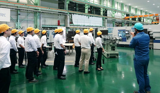 村田機械で作られている社会を支えているモノがどのようにしてつくられるのか、モノづくりの現場を実際に見学いただきます。製造現場や稼働する製品を間近で見ていただくことで製品のスケール、スピード、ダイナミックさを体感いただけます。