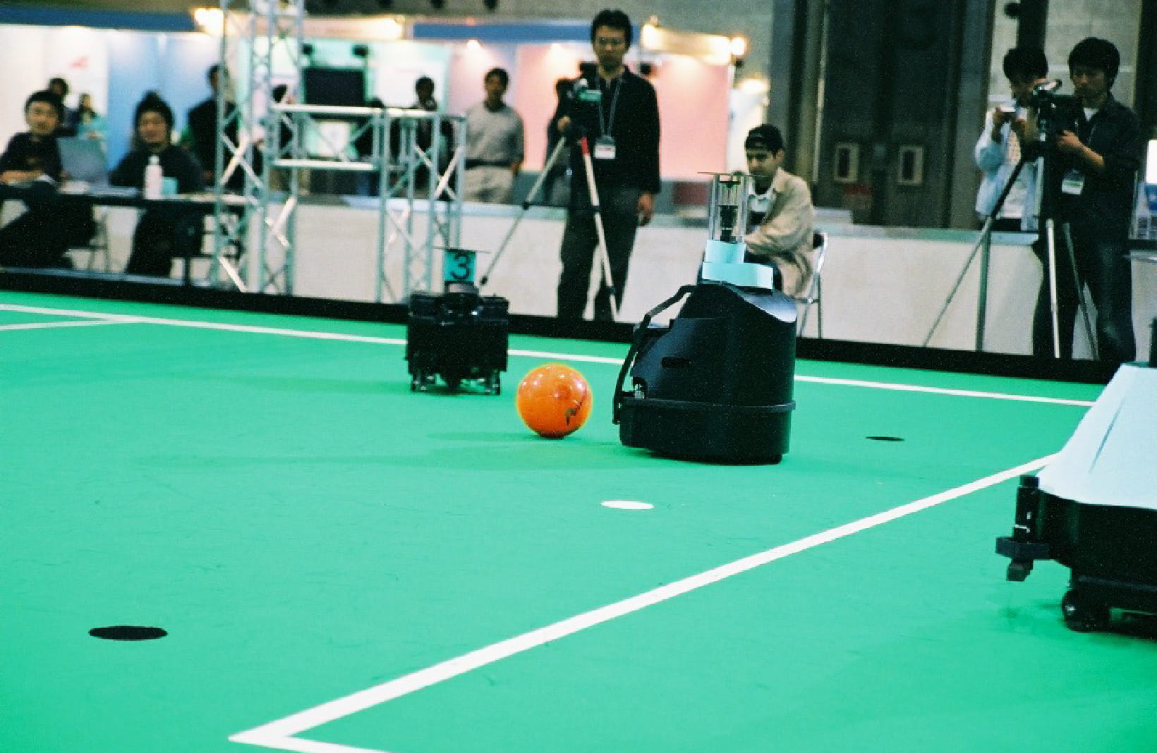 駐在を終えて繊維機械事業部に復帰後、再びメカ設計者として設計業務に取り組みながらもその思いは消えていませんでした。半年後、たまたま私が目にしたのが「RoboCupプロジェクトメンバー募集」の社内公募でした。このことがその後の会社人生を大きく変える転機になったと思います。「ロボット開発を通じてさまざまな制御技術や知見を吸収できれば村田機械の製品群の性能アップにもつながる」というプロジェクトの趣旨にも大いに共感。繊維機械事業部での開発に後ろ髪を引かれながらも、“メカ+ソフトウェアの技術の組み合わせ”でこれまでできなかったことを実現したい、とプロジェクトへの応募を決めました。ちなみに「RoboCup」とは自律移動型ロボットによる競技会で、公募されていたのは「ロボカップサッカー」に参加するためのロボット開発に携わるメンバーです。