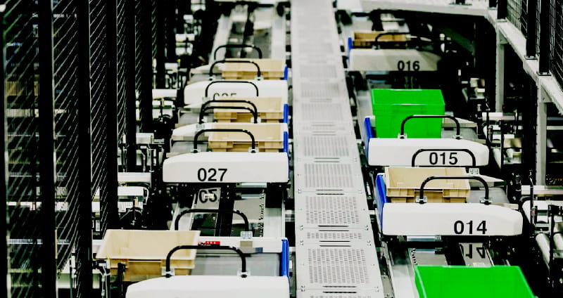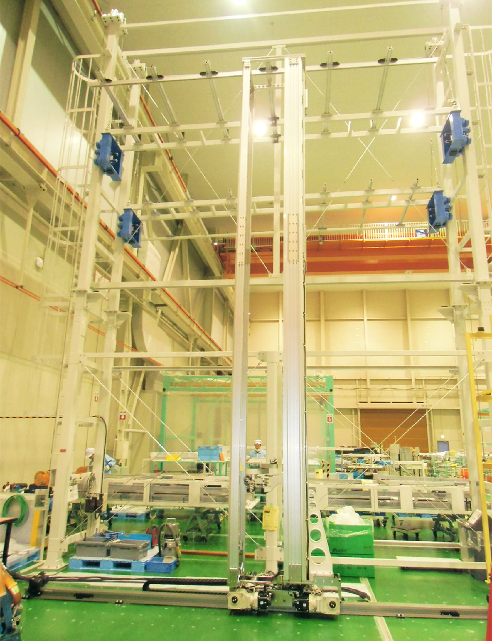ところがそんな時、またしても運命の機会が訪れます。偶然参加した会議でRGV(有軌道無人搬送台車)の走行動作のサイクルタイム短縮という課題が持ち上がり、「RoboCup」プロジェクトで培った技術を生かせないかと提案したところ、一度試してみようということに。走行位置を認識する新しいセンサシステムの開発に加え、そこから得られる情報と走行車輪を前後輪別々にトルク制御することで、できるだけスリップしない走行を実現しようと提案したところ、これが効果を発揮。これまで停止間際にかかっていた低速走行(クリープ走行)が不要になり、ぴたっと止めることができたのです。さらにこの技術を発展させ、私はクレーン台車の制振制御にも着手。クレーン上端が揺れるため止まってすぐに荷物の出し入れができないという課題を克服しようと、クレーン筐体の振動解析を行い、振動を制御する走行パターンを実現しました。この成功により、走行時間は長くなっても荷物の出し入れまでの時間を短縮することができたのです。これら走行制御に村田機械独自の制御アルゴリズムを組み込む開発は現在の村田機械の走行制御、制振制御技術の礎となり、他社にはない強みになっていると自負しています。